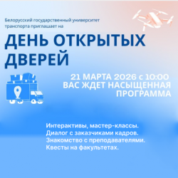 Белорусский государственный университет транспорта присоединяется к республиканскому Единому дню открытых дверей и приглашает абитуриентов и их родителей познакомиться с университетом, определиться с будущей специальностью и сделать первый шаг к успешной карьере.